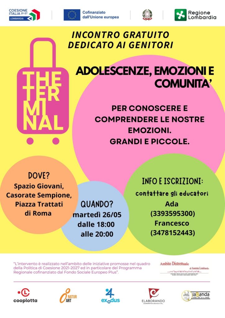 Nell’ambito del progetto distrettuale “The Terminal”, finanziato da Regione Lombardia, si informa di un’iniziativa rivolta ai genitori appartenenti all’intero Ambito Distrettuale di Somma Lombardo, che si svolgerà a Casorate Sempione il prossimo 26 maggio dalle ore 18.00 alle 20.00.
