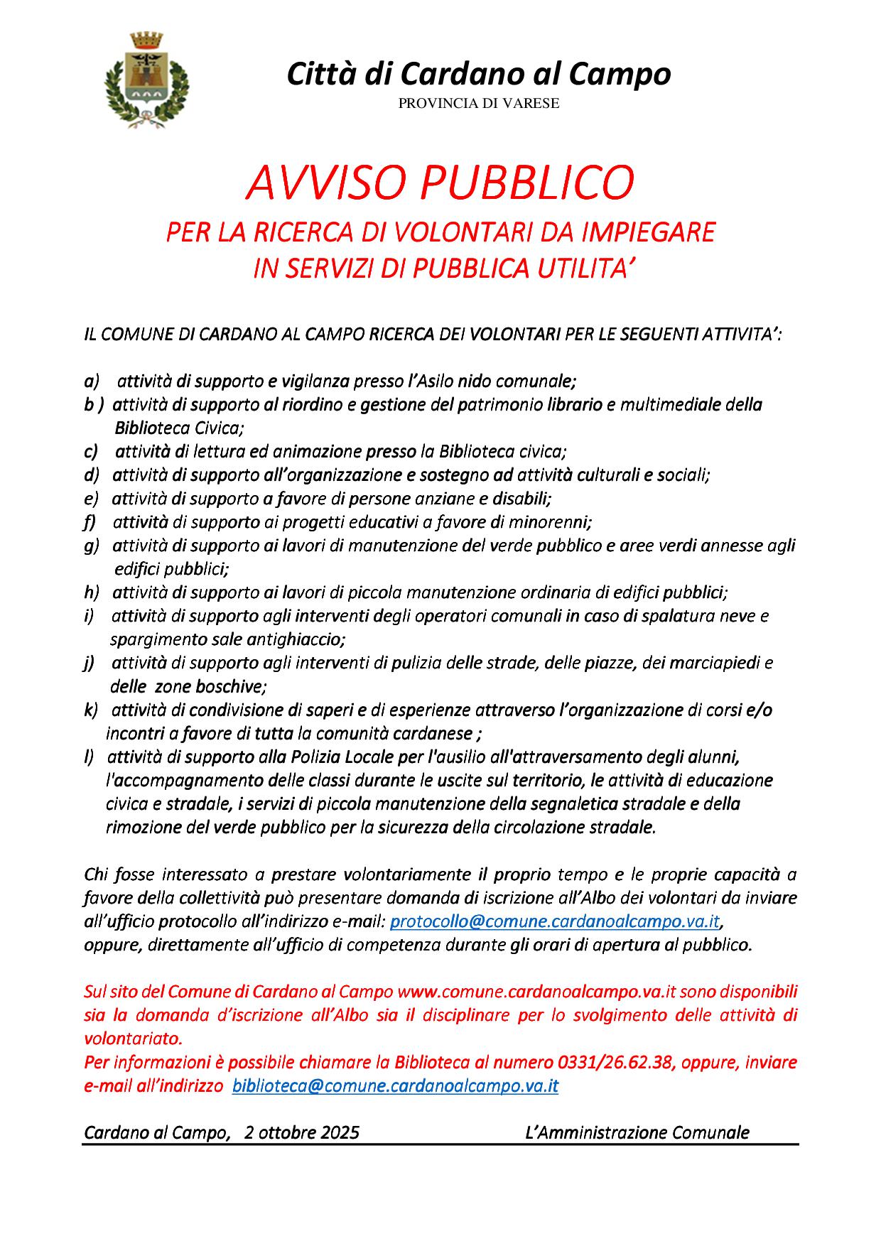 Il Comune di Cardano al Campo ricerca volontari da impiegare nei servizi di pubblica attività come dettagliato nell’avviso pubblico allegato.