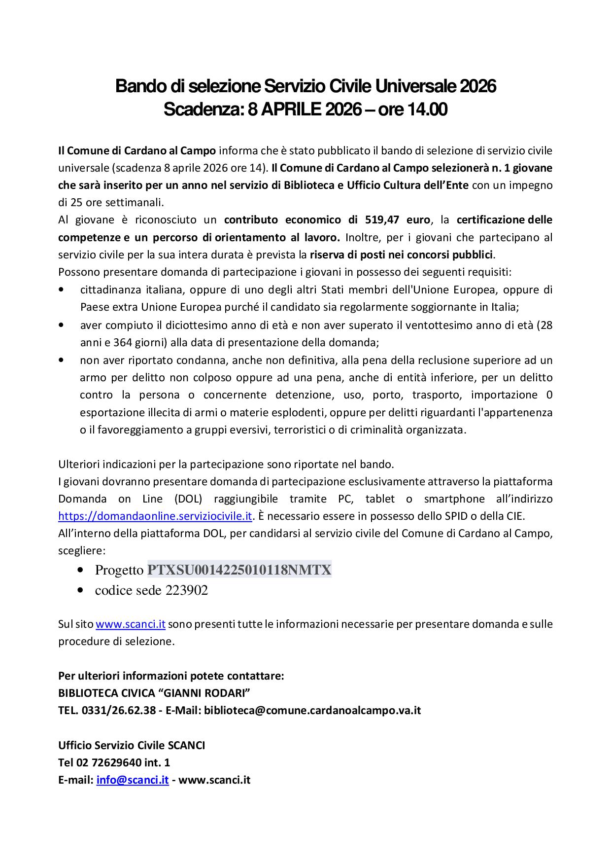 Informiamo che è stato pubblicato il bando ordinario di Servizio Civile Universale 2026 sul sito del Dipartimento per le Politiche Giovanili e il Servizio Civile Universale https://www.politichegiovanili.gov.it/comunicazione/news/2026/2/bando-ordinario-2026/ e sul sito di SCANCI www.scanci.it .