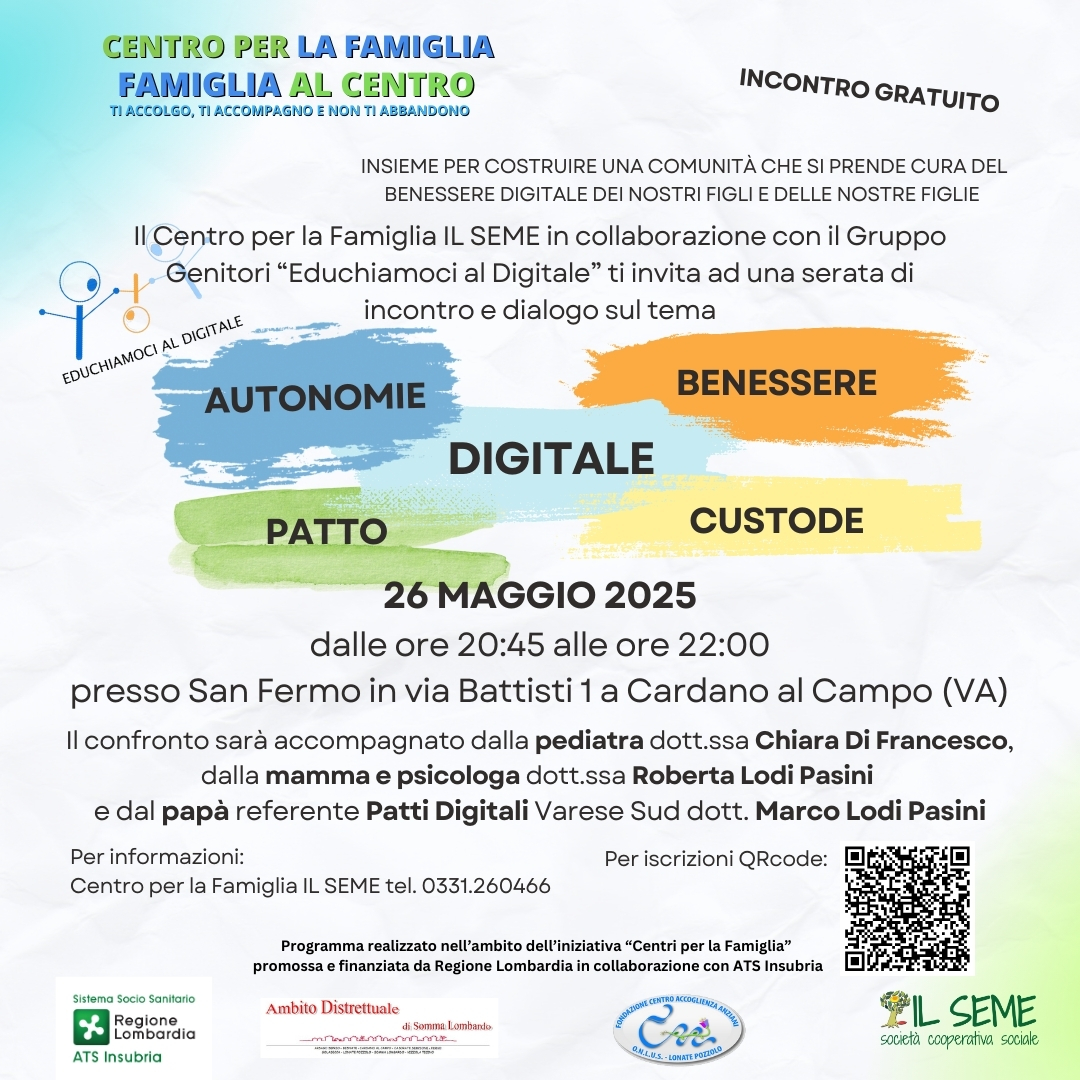 Il Centro per la Famiglia Il Seme con il gruppo Genitori “Educhiamoci al digitale” propone una serata di incontro e dialogo che si terrà lunedì 26 maggio dalle ore 20:45 alle 22:00 presso San Fermo in via C.Battisti nr.1.