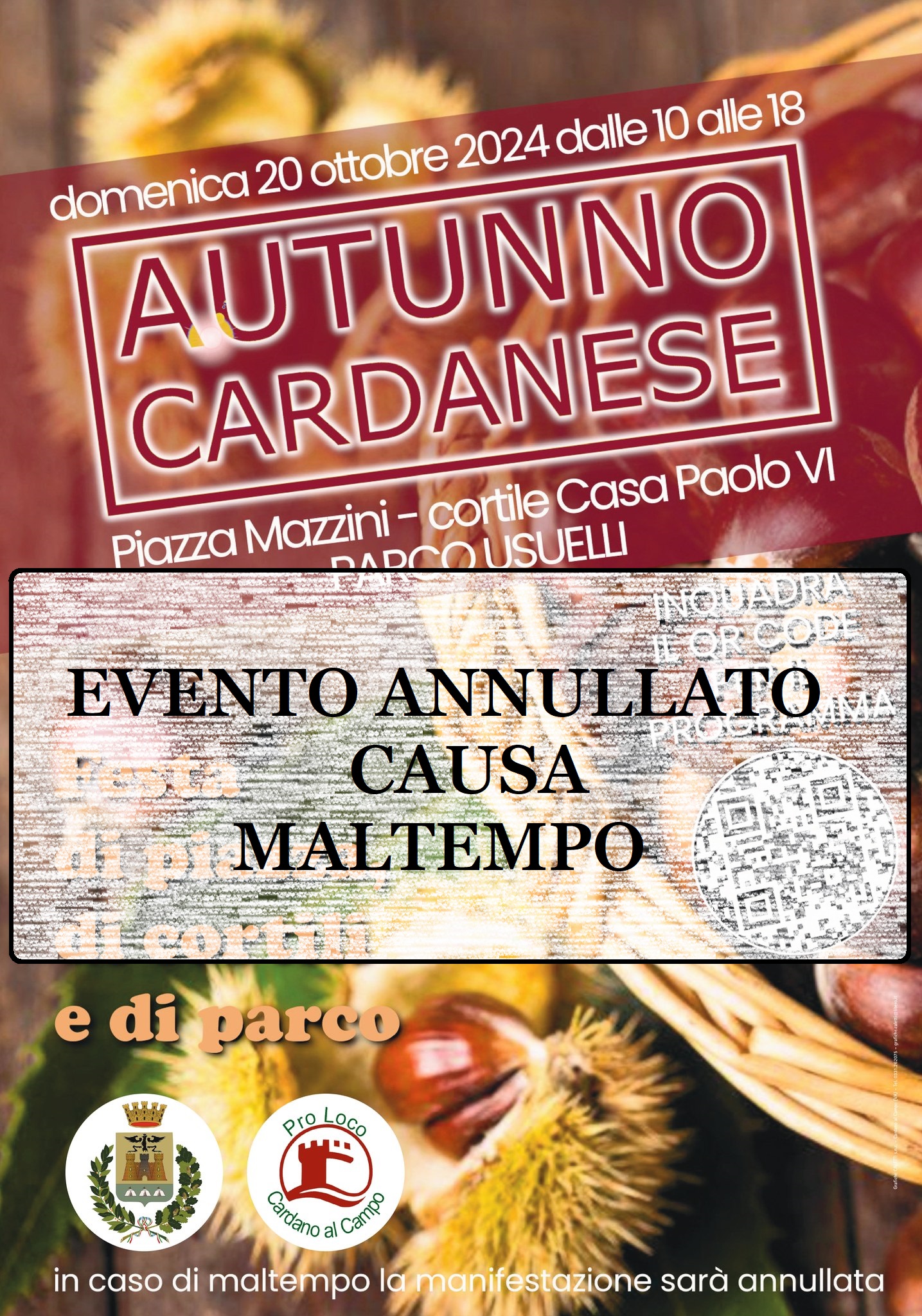 Causa maltempo, l’Amministrazione Comunale comunica, con dispiacere, l’annullamento della manifestazione “Autunno Cardanese”, prevista per domenica 20 ottobre.
