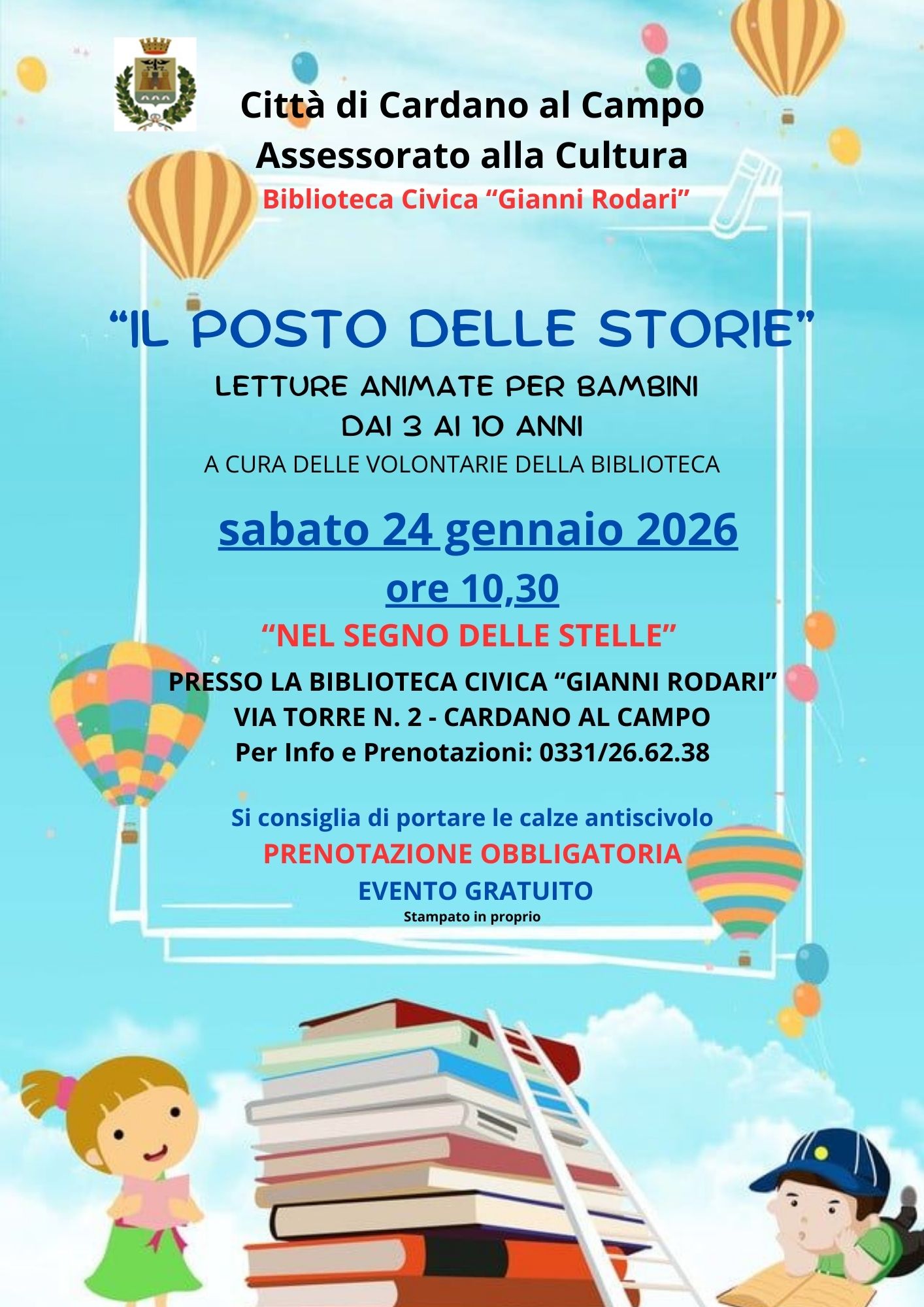 Nell’ambito della rassegna “Il posto delle storie”, sabato 24 gennaio 2026 alle ore 10:30 presso la Biblioteca Civica, si terrà la lettura animata dal titolo “Nel segno delle stelle”, dedicata ai bambini dai 3 ai 10 anni.