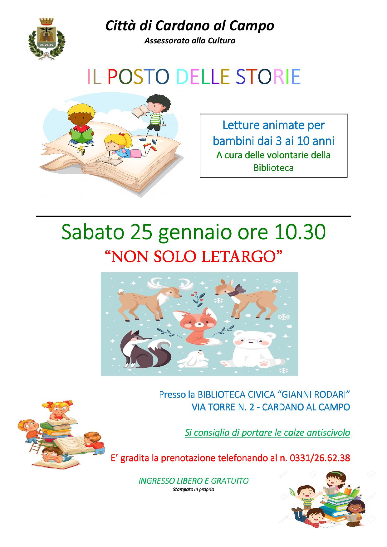 Nell’ambito della rassegna “Il posto delle storie” sabato 25 gennaio 2025 alle ore 10.30 presso la Biblioteca si terranno letture animate dal titolo “Non solo letargo”, dedicate ai bambini dai 3 ai 10 anni.