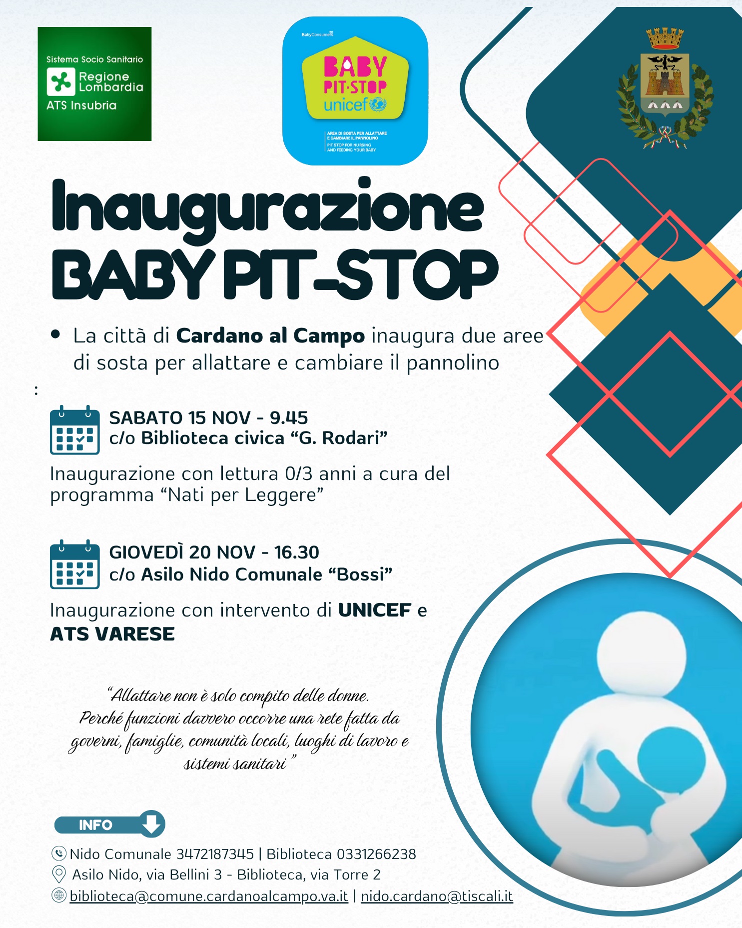 L’Amministrazione Comunale è lieta di annunciare che presso il territorio della Città di Cardano al Campo verranno inaugurate due aree di sosta per allattare e cambiare il pannolino, cioè due BABY PIT STOP: