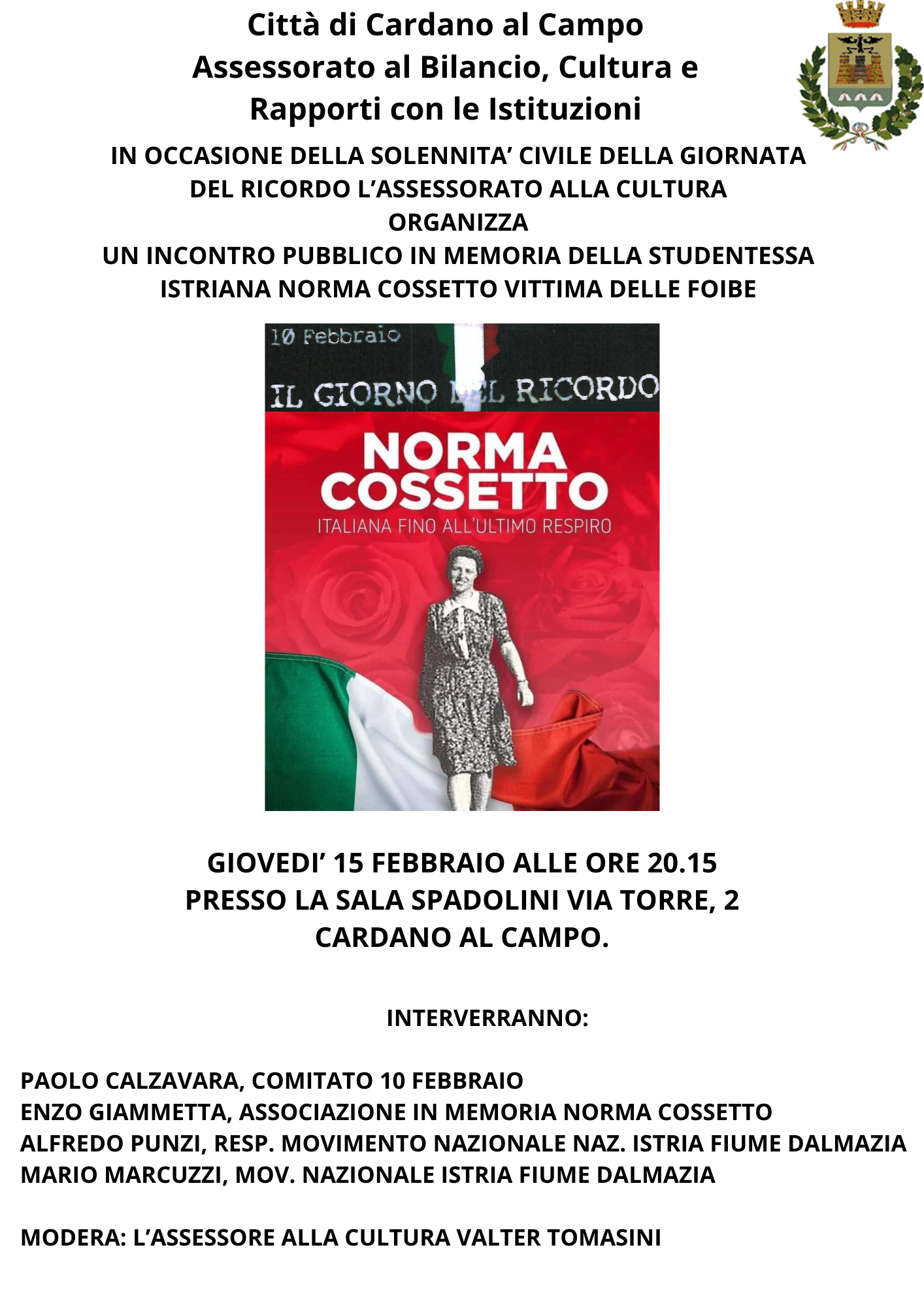 In occasione della solennità civile della Giornata del ricordo in memoria delle vittime delle Foibe, dell’esodo Giuliano-Dalmata e delle vicende del confine Orientale, l’Assessorato alla Cultura del Comune di Cardano al Campo organizza un incontro pubblico in memoria della studentessa istriana Norma Cossetto vittima delle foibe.