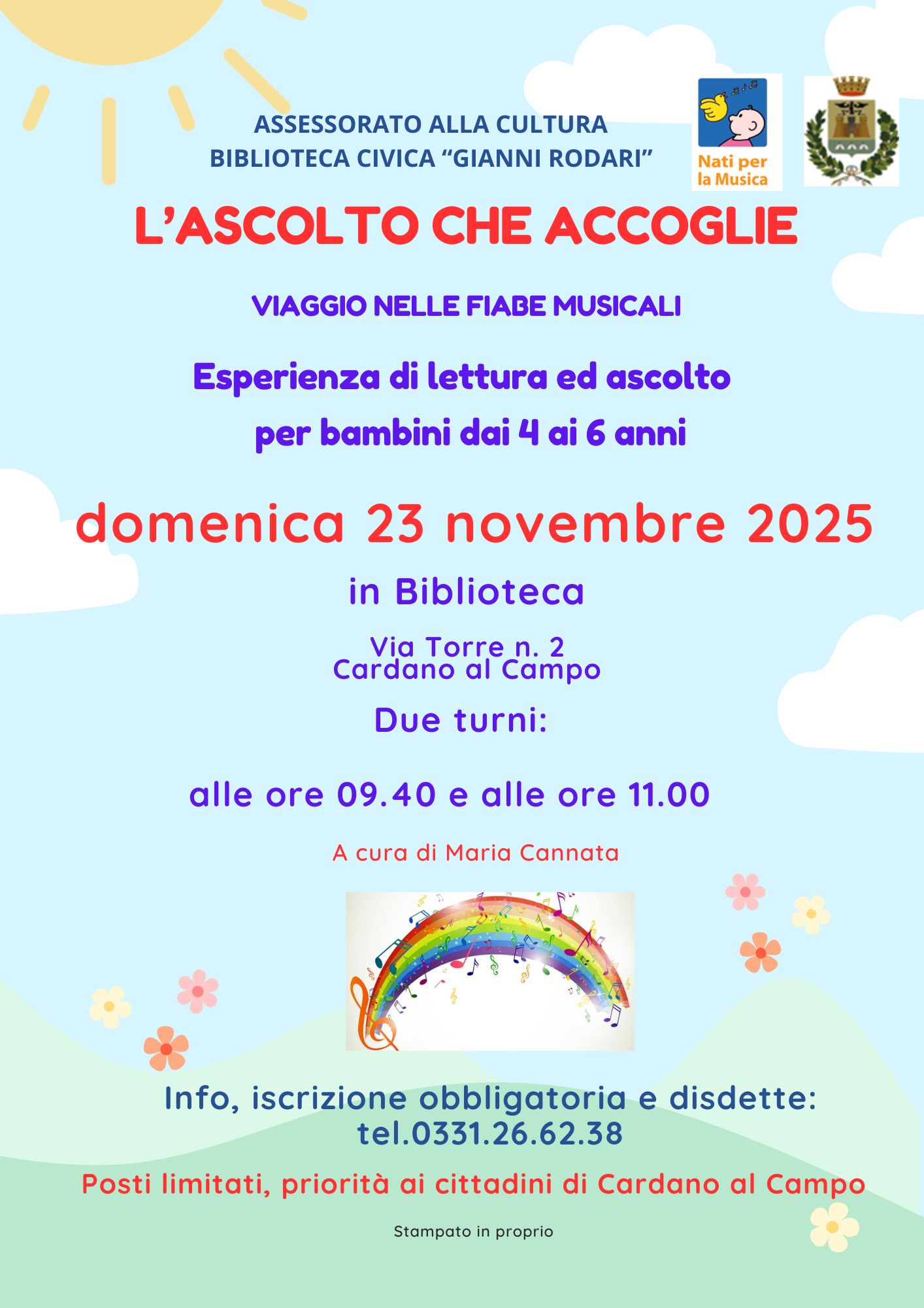 L’evento si terrà domenica 23 novembre 2025 presso la Biblioteca Civica “G. Rodari” sita in Via Torre alle ore 9.40 e alle ore 11.00 (due turni).
