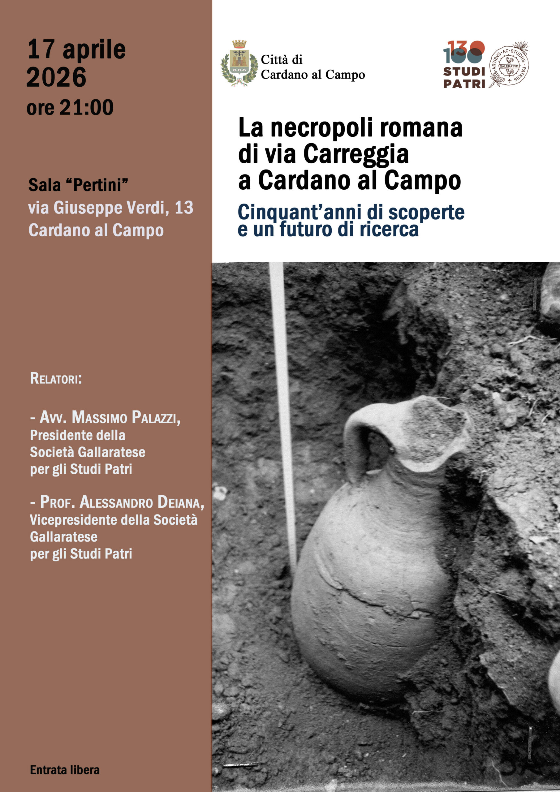 L’Amministrazione Comunale invita la Cittadinanza all’incontro pubblico, realizzato in collaborazione con la Società Gallaratese per gli Studi Patri, dal titolo “La necropoli romana di via Carreggia a Cardano al Campo. Cinquant’anni di scoperte e un futuro di ricerca”.