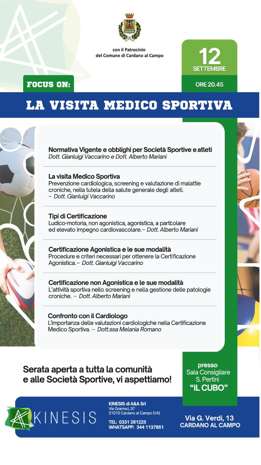 L’Assessorato all’Attività sportiva propone un incontro informativo sulla visita medico sportiva realizzato da KINESIS con il patrocinio del Comune di Cardano al Campo.