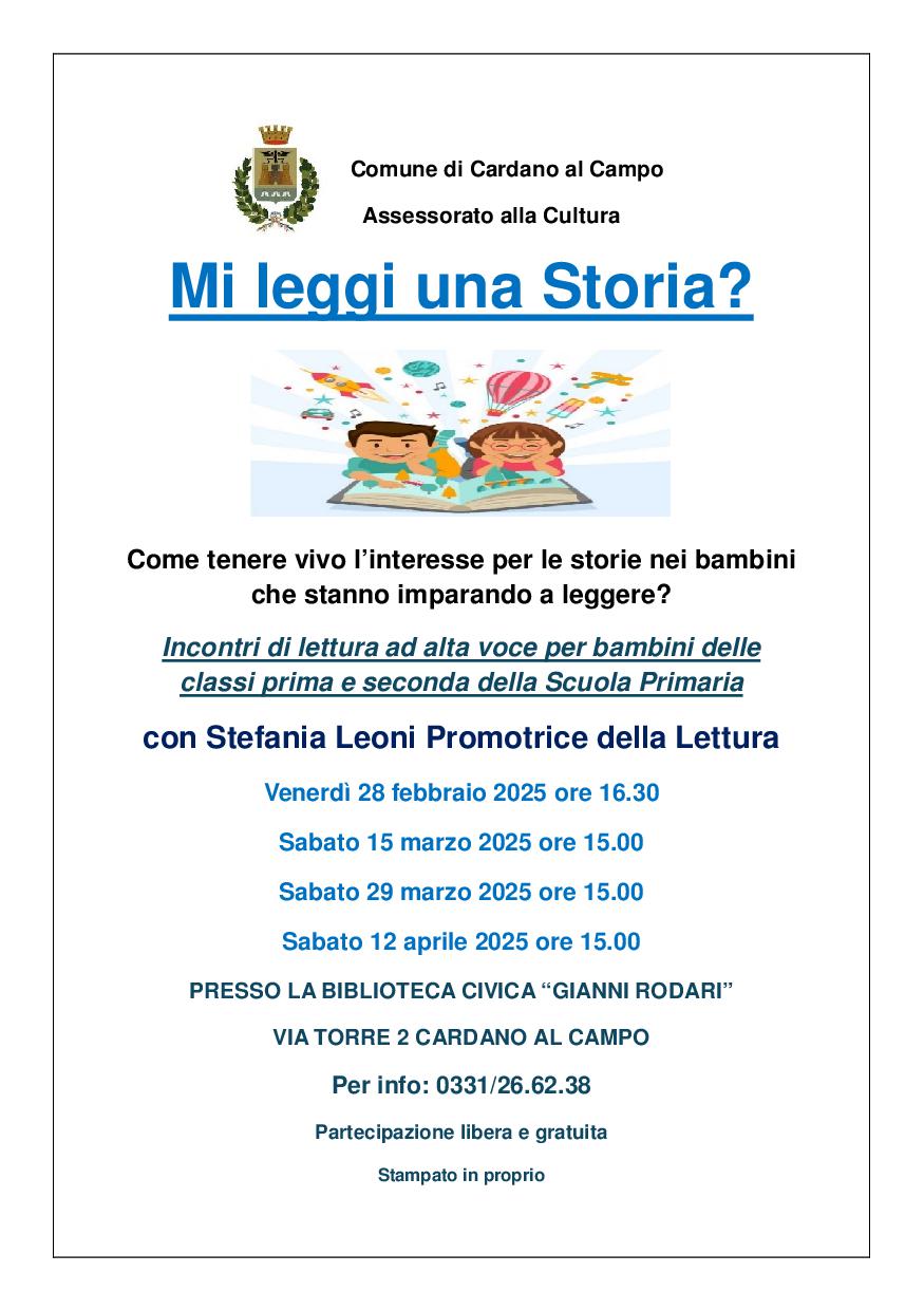 L’assessorato alla Cultura, in collaborazione con la Biblioteca Civica “Gianni Rodari” di Cardano al Campo, è lieto di presentarvi un’iniziativa dedicata ai bambini e alle bambine delle classi prima e seconda della Scuola Primaria.