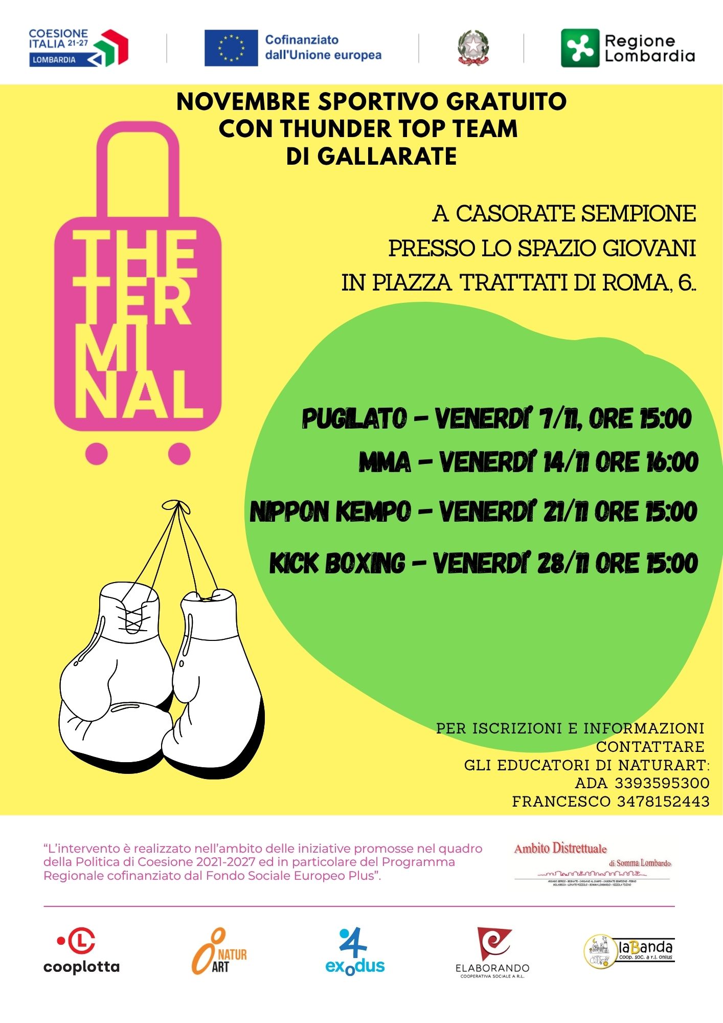 - “Novembre sportivo gratuito” con Thunder Top Team a Casorate Sempione presso lo Spazio Giovani a novembre 2025 il venerdì pomeriggio.