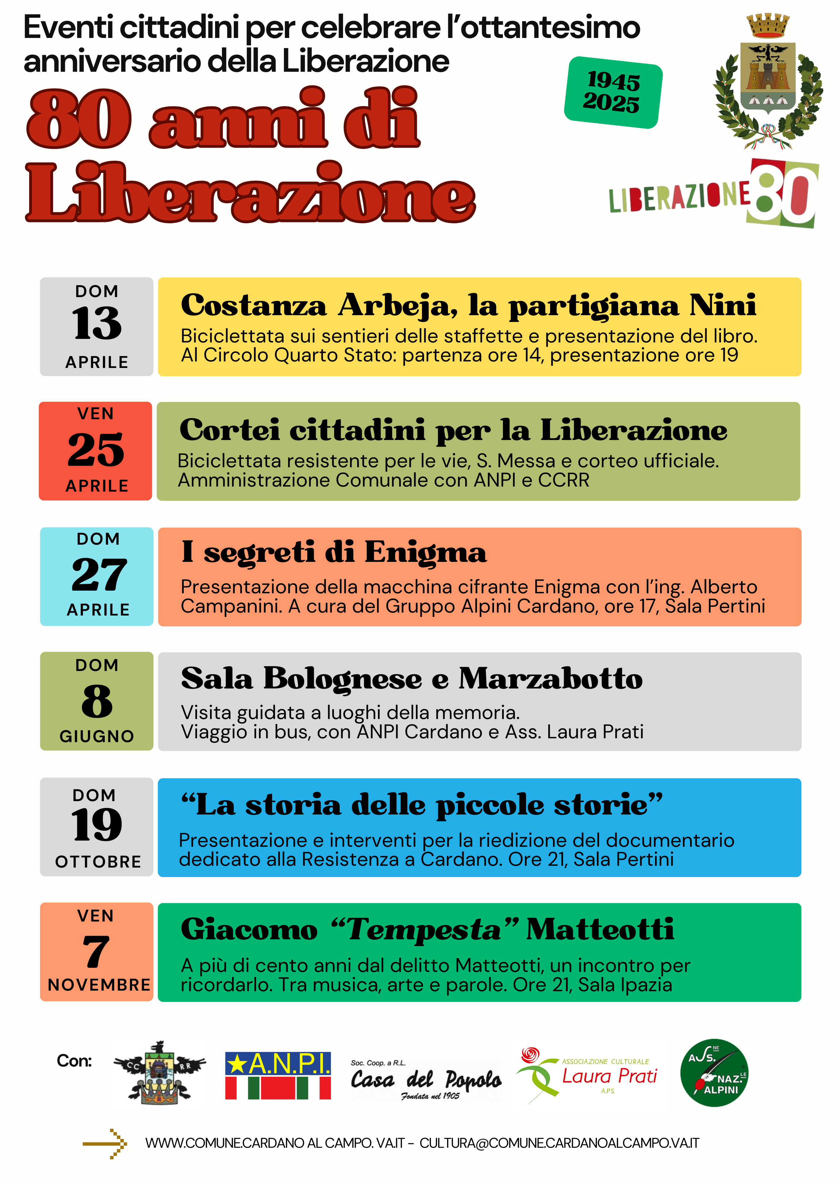Per l’80° anniversario della Liberazione sono previste numerose iniziative organizzate con la collaborazione di Anpi di Cardano al Campo, Gruppo Alpini sezione di Cardano al Campo, associazione Culturale Laura Prati, Cooperativa Casa del popolo e con Consiglio Comunale dei ragazzi e delle ragazze dell’Istituto Scolastico Comprensivo Maria Montessori di Cardano al Campo.