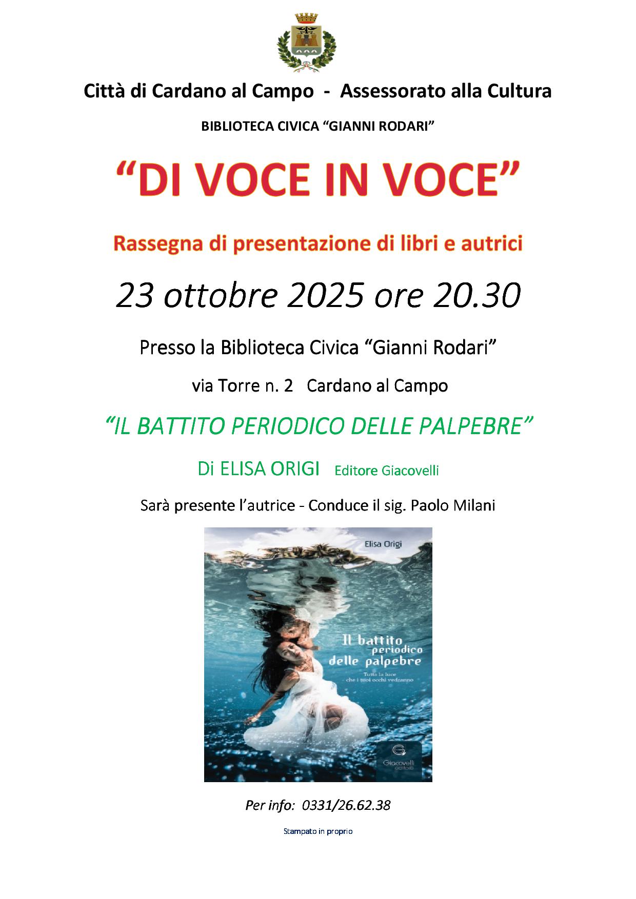 L’Assessorato alla Cultura, nell’ambito della rassegna di presentazioni di libri e autrici “Di voce in voce“, propone la presentazione del libro “Il battito periodico delle palpebre” di Elisa Origi – Editore Giacovelli.