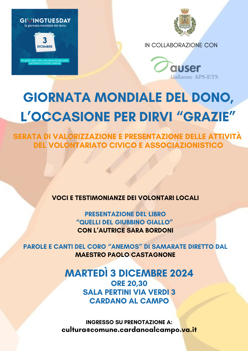 Quest’anno anche l’amministrazione comunale di Cardano al Campo aderirà ed è lieta di invitarvi all’evento, organizzato con la collaborazione dell’Associazione Auser di Gallarate, che si terrà martedì 3 dicembre alle 20.30 presso la Sala Pertini, in via Verdi 3.
