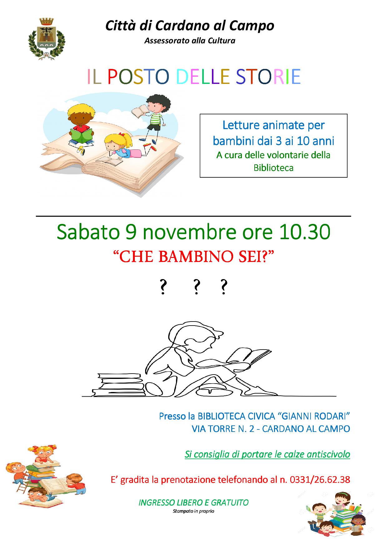 Nell’ambito della rassegna “Il posto delle storie” sabato 9 novembre alle ore 10.30 presso la Biblioteca si terranno letture animate dedicate ai bambini dai 3 ai 10 anni dal titolo “Che bambino sei ?”