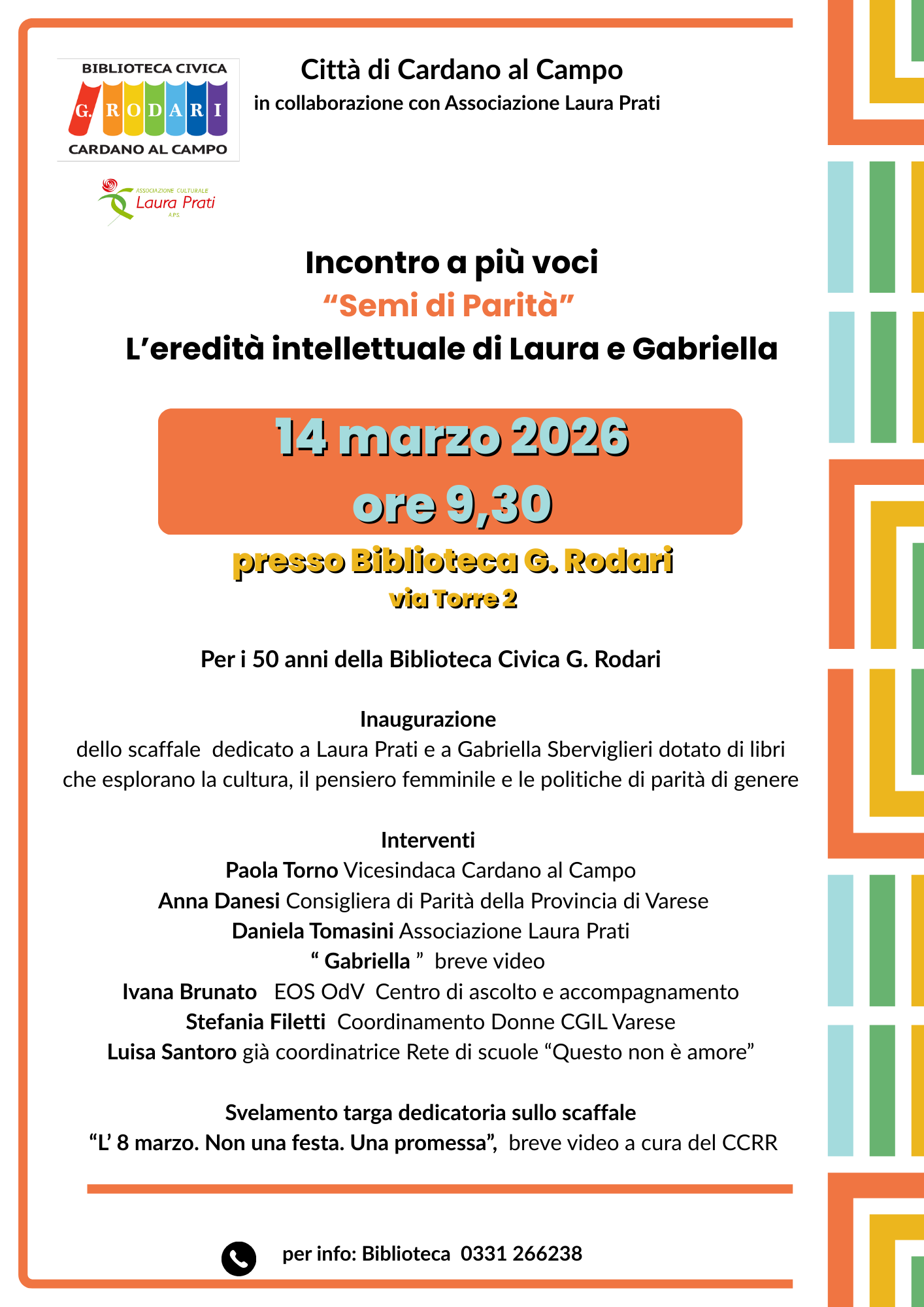 In occasione del 50° Anniversario della Biblioteca Civica “Gianni Rodari” ( 10 febbraio 1976 – 10 febbraio 2026), tutta la Cittadinanza è invitata a partecipare all’inaugurazione dello scaffale dedicato a Laura Prati e Gabriella Sberviglieri dotato di libri che esplorano la cultura, il pensiero femminile e le politiche di parità di genere.